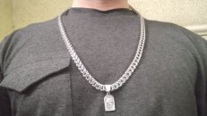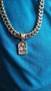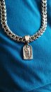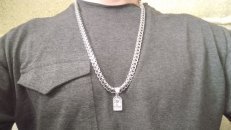 С лицевой стороны на кресте изображено Христово распятие. С внутренней стороны изображены Божья Матерь, Святая Матрона, Святой Николай, Святой Серафим, Святой Георгий, Архангел Михаил.На данной странице представлен мужской крест из серебра с камнями.