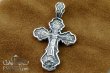 На лицевой стороне креста изображено Распятие Иисуса Христа. На обороте — короткая молитва, обращенная к Господу, которая традиционно помещается на нательных крестах: «Спаси и сохрани».Высота: 5.5 мм